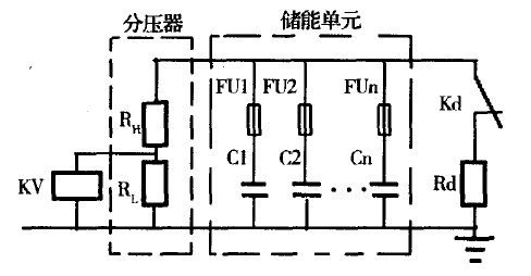 脈沖電容器儲(chǔ)能后,由控制電路發(fā)送命令進(jìn)行觸發(fā)放電(ETcG發(fā)射)。ETCG發(fā)射精度和一致性與PPS儲(chǔ)能量密切相關(guān),電容器儲(chǔ)能大小與其充電電壓的量值平方成正比,因此控制電路必須能精確控制充電電壓量值,這可以通過(guò)與被充電容器組并聯(lián)"分壓器一電壓繼電器組"來(lái)實(shí)現(xiàn),見圖2。