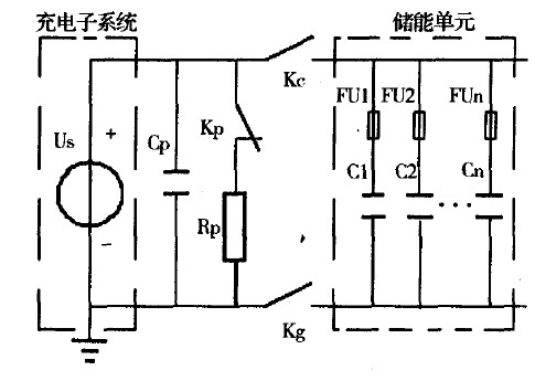通常,充電子系統(tǒng)內(nèi)部配有過(guò)電流、過(guò)電壓和過(guò)熱等故障保護(hù)或異常告警裝置。但這些裝置的保護(hù)范圍一般僅限于充電子系統(tǒng)內(nèi)部,PPS放電時(shí)浪涌電壓等外部因素仍可能造成充電設(shè)備損壞。因此,在儲(chǔ)能單元和充電子系統(tǒng)間還需配置一些隔離和保護(hù)電路。圖1給出了用于ETCG研究的PPS所配置的充電隔離及保護(hù)電路。圖1中,充電隔離開關(guān)(Kc)和地絕緣隔離開關(guān)(Kg)在充電結(jié)束后打開,用以防止PPS放電時(shí)由負(fù)載等因素產(chǎn)生的浪涌高電壓通過(guò)充電子系統(tǒng)對(duì)地放電,可以避免因此所造成的充電設(shè)備絕緣損壞;充電輸出終端并聯(lián)了一小容量電容器(Cp)及其安全釋能電路(開關(guān)Kp、電阻Rp),目的在于防止空載誤充電,以避免在此情況下充電電路末端電壓急劇升高損壞充電設(shè)備。