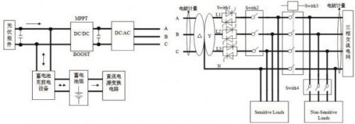 微網(wǎng)逆變器系統(tǒng)將可再生能源(如太陽能,風(fēng)能,水能,地?zé)崮埽镔|(zhì)能等)轉(zhuǎn)變?yōu)榕c電網(wǎng)同頻、同相的交流電,優(yōu)先輸送給當(dāng)?shù)刎?fù)荷供電,剩余的電能饋入電網(wǎng)。微網(wǎng)逆變器系統(tǒng)主要包括:光伏組件、蓄電池組、蓄電池充放電設(shè)備、DC/DC變換器、微網(wǎng)逆變器、靜態(tài)開關(guān)等。