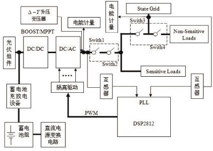 正常工作時(shí),開關(guān)Switch1、Switch2、Switch3、Switch4同時(shí)閉合,為當(dāng)?shù)刎?fù)荷提供電能;當(dāng)出現(xiàn)電網(wǎng)缺相、電壓嚴(yán)重跌落等非正常狀況時(shí),由DSP檢測出異常情況,做出判斷決策,并控制開關(guān)的開通與0關(guān)斷。這時(shí),開通Switch1和Switch2,關(guān)斷Switch3,保證重要負(fù)荷的供電。當(dāng)逆變器發(fā)生故障時(shí),立即斷開Switch1,逆變器退出,同時(shí)斷開Switch4,由電網(wǎng)對重要負(fù)荷供電。當(dāng)逆變器故障消失時(shí),在與電網(wǎng)同步后,開通Switch1,再閉合Switch4,恢復(fù)對當(dāng)?shù)刎?fù)荷的供電。當(dāng)需要檢修逆變器時(shí),先斷開開關(guān)Switch2,檢修完成后,重新閉合Switch2。
