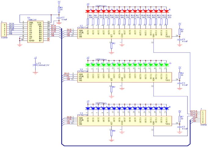 我們以一個led小模塊來分析其耗電狀況!如圖2,是一個以長運通光電推出的CYT62726為驅(qū)動芯片的led小模塊,其供電電壓為5V,先不計算外圍器件的功耗,因為它們在整個屏中所占的比重極小,那整個屏所耗的功率都在燈上,先計算燈點功率為Pled=n*Uvf*Iled(n為通道數(shù),Uvf為led燈點的壓降,Iled為設(shè)定的電流值)CYT62726驅(qū)動IC的管腳壓降一般為0.6V左右,紅綠藍燈點的壓降分別為1.8V,3.0V,3.0V如此那每個通道只需4V(3.0+0.6V)即可正常工作,保守一點可以設(shè)置成紅燈通道2.8V,藍綠通道3.8V而實際上我們的供電電壓都為5V,就相當于增加了1V*Iled的功耗在IC內(nèi)部,所以如上可以設(shè)想只要將供電電源下降至紅2.8V,綠3.8V,藍3.8V,我們就可以省去那加在IC通道上的1V*Iled功耗,在其他器件不變的情況下便可實現(xiàn)led顯示屏節(jié)能至少15%以上,再加上本身對led屏散熱要求的降低也能實現(xiàn)一定程度上的節(jié)能,這對于一個大屏來說已經(jīng)是一個相當大的數(shù)字了,相信客戶會樂于接受!