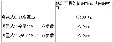 另一組交流特性描述了電源對于變化的響應速度。瞬態(tài)響應指標說明了當負載或設置改變后輸出變?yōu)榉€(wěn)定直流的速度。大多數(shù)電源輸出端并聯(lián)了大電容以便提供清潔、穩(wěn)定的直流。當此電容與負載電阻并聯(lián)時,得出一個時間常數(shù)并且時間常數(shù)大小會隨負載阻抗變化。由于與負載電阻緊密相關,所以設置變化的響應必須針對具體負載規(guī)定。常見指標中包括開路、短路或具體電阻值等負載。