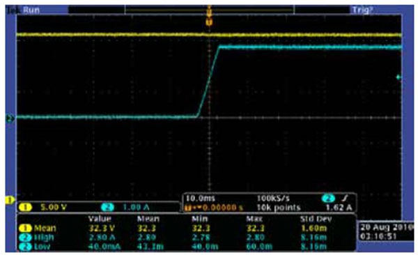 圖4 示波器屏幕顯示了當負載電流從0A變至2.8A時,吉時利2200-32-3的輸出電壓調節(jié)。在整個變化過程中,輸出電壓保持穩(wěn)定