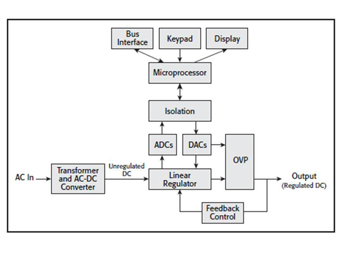 歷史上,直流電源用戶使用電位計設置輸出電壓或電流。今天,微處理器從用戶接口或遠端接口接收輸入。數(shù)模轉換器(DAC)接收數(shù)字設置,將其轉換為模擬值并用作模擬調節(jié)器的參考。設置分辨率和準確度的值由轉換質量和調節(jié)過程決定。