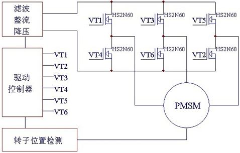 方案中無刷直流電機(BLDCM)輸入(110V/220V)交流電,經(jīng)轉(zhuǎn)換器(converter)轉(zhuǎn)成直流,要轉(zhuǎn)入電機線圈前須先將直流電壓由換流器(inverter)轉(zhuǎn)成3相電壓來驅(qū)動電機。換流器(inverter)由6個功率MOSFET(VT1~VT6)分為上臂(VT1、VT3、VT5)/下臂(VT2、VT4、VT6)連接電機作為控制流經(jīng)電機線圈的開關(guān)。MCU提供PWM(脈沖寬度調(diào)制)決定功率MOSFET HS2N60IB開關(guān)頻度及換流器(inverter)換相的時機。