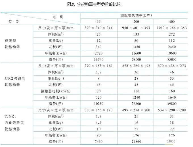 目前市場上流行的三種類型軟起動器:在線型、旁路型、內(nèi)置旁路型。在線型軟起動器基本上是國外品牌,市場上的用量份額大約占到了1/4,都是些形象工程和無知工程,大約有1/2以上的采用旁路型軟起動器。從2003年內(nèi)置旁路型面世后,開始普及內(nèi)置旁路型軟起動器。通過上述的介紹內(nèi)置旁路型軟起動器的技術先進性,讀者已有了一個理性的認識,下面筆者用數(shù)據(jù)比較來達到量化分析,如附表所示。附表中的造價是指廠家的公開報價,用戶的采購價一般都低于此價格。