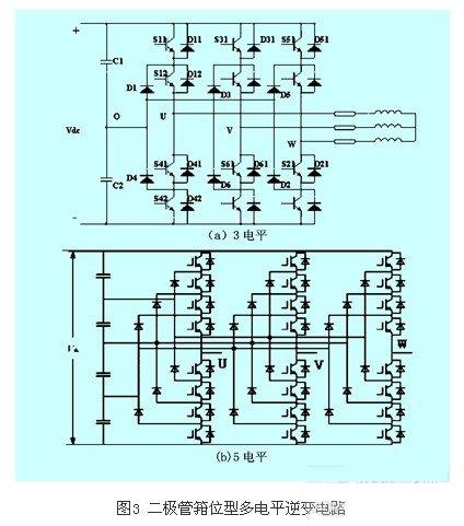 1977年德國(guó)學(xué)者h(yuǎn)oltz首次提出了利用開關(guān)管來(lái)輔助中點(diǎn)箝位的三電平逆變器主電路,1980年日本的a·nabae等人對(duì)其進(jìn)行了發(fā)展,提出了二極管箝位式逆變電路。圖3(a)為二極管箝位逆變電路,它具有2個(gè)電容,能輸出3電平的相電壓。