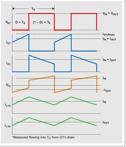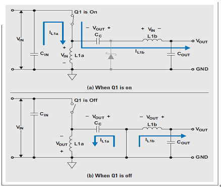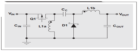 Q1 關(guān)閉時(shí),L1b 的電壓必須為 VOUT,因?yàn)槠渑c COUT 并聯(lián)。由于 COUT 被充電至 VOUT,因此 Q1 關(guān)閉時(shí) Q1 的電壓為 VIN + VOUT;這樣一來, L1a 的電壓便為相對(duì)于 Q1 漏極的 –VOUT。Q1 開啟時(shí),充電至 VOUT 的電容 CC 與 L1b 串聯(lián);因此 L1b 的電壓為 +VIN,而二極管 D1 的電壓則為 VIN + VOUT。