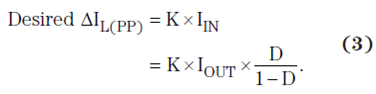 設(shè)計(jì)任何 PWM 開關(guān)調(diào)節(jié)器的首要步驟之一便是決定允許多少電感紋波電流 ΔIL(PP)。過多會(huì)增加 EMI,而過少又會(huì)導(dǎo)致不穩(wěn)定的 PWM 運(yùn)行。一般原則是給 K 分配一個(gè)介于 0.2 和 0.4 平均輸入電流之間的值。理想紋波電流的計(jì)算如下: