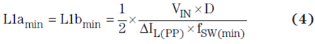 在理想緊密型耦合電感中,每個(gè)電感的單芯上都有相同的繞組數(shù),這時(shí)耦合迫使紋波電流在兩個(gè)耦合電感之間等分。在現(xiàn)實(shí)耦合電感中,電感并沒有相等的電感,并且紋波電流也不會(huì)完全相等。無論如何,在理想紋波電流值的情況下,如果存在兩個(gè)單獨(dú)的電感,則我們將耦合電感中要求的電感估算為實(shí)際需要的一半,如方程式 4 所示: