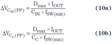 方程式 10a 和 10b 計(jì)算了完全由各自電容器電容值引起的輸出紋波電壓部分: