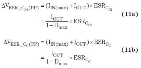 方程式 11a 和 11b 計(jì)算了完全由各自電容器 ESR 值引起的輸出紋波電壓部分: