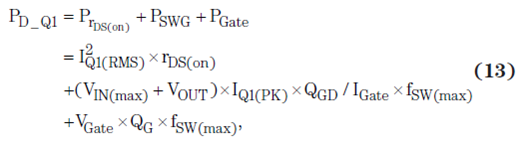 在相關(guān)環(huán)境溫度下,F(xiàn)ET 功耗額定值必須大于傳導(dǎo)損耗(FET rDS(on) 的函數(shù))和開關(guān)損耗(FET 柵極電荷的函數(shù))的和,計(jì)算方法如方程式 13 所示: