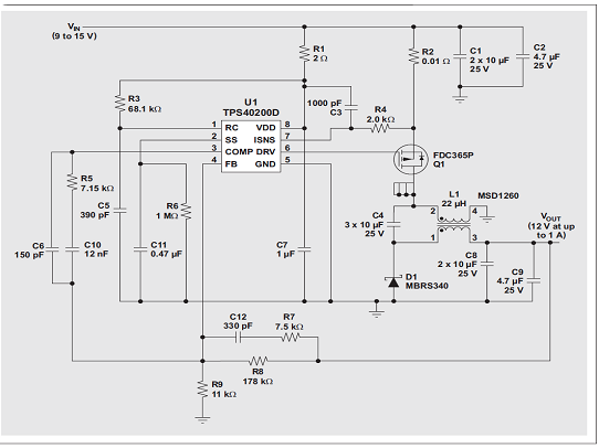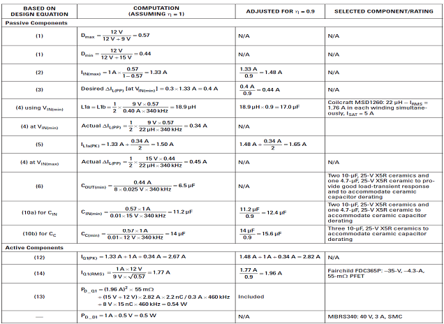 就本例而言,諸多要求都是針對(duì)一個(gè) η= 0.9 峰值效率的 12-V、1-W 電源。負(fù)載為穩(wěn)態(tài),因此幾乎看不到負(fù)載瞬態(tài)。2-A 輸入電源為 9 到 15V。我們選擇了異步電壓模式控制器即 TI TPS40200,其工作在 340 和 460kHz 之間的開關(guān)頻率下。輸入端和快速電容器的最大允許紋波分別為彼此交叉最大電壓的 1%。最大輸出紋波為 25 mV,而最大環(huán)境溫度為 55ºC。由于 EMI 并不是問題,通過使用最小輸入電壓,我們選擇了具有更低電感值的電感。下一頁的表 1 概括了前面介紹的一些設(shè)計(jì)計(jì)算方法。我們忽略了方程式 7 到 9 以及方程式 11,因?yàn)槭褂昧烁?RMS 電流額定值的低 ESR 陶瓷電容。