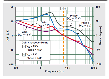 圖 7 VIN=9V 和 15V 且 IOUT=1A 時(shí)的環(huán)路響應(yīng)
