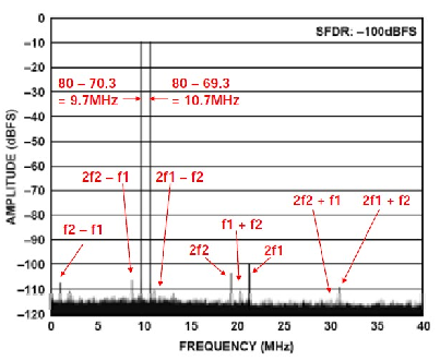 圖1:二階和三階交調(diào)積其中,f1 = 5 MHz, f2 = 6 MHz