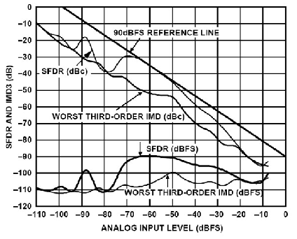 當(dāng)輸入信號處于ADC滿量程范圍的幾dB之內(nèi)時,IMD可能開始增加(但在設(shè)計優(yōu)良的ADC中可能不會如此)。出現(xiàn)這種現(xiàn)象的確切電平取決于具體的ADC--有些ADC在其滿量程輸入范圍內(nèi),其IMD積不會顯著增大,但多數(shù)ADC會。當(dāng)輸入信號繼續(xù)增加并超過滿量程范圍時,ADC應(yīng)充當(dāng)理想的限幅器,IMD積將變得非常大。出于對此類原因的考慮,ADC并無二階和三階IMD交調(diào)截點(diǎn)額定值。需要注意的是,DAC實(shí)際上存在同樣的情況。在兩種情況下,單音或多音SFDR(無雜散動態(tài)范圍)額定值是廣受認(rèn)可的數(shù)據(jù)轉(zhuǎn)換器失真性能的衡量指標(biāo)?! ?br />
