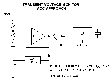如果軟件比較具有高效編碼并且ADC無(wú)需處理器干預(yù),系統(tǒng)每次采樣可執(zhí)行少于10條指令,這就要求處理器具有4MIPS的能力。這種執(zhí)行能力并不適合采用電池供電(圖1)。需要考慮用模擬方法對(duì)輸入瞬態(tài)偏離進(jìn)行響應(yīng),用以替代連續(xù)跟蹤方案?! ?br />