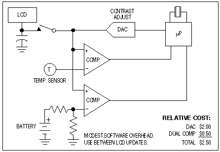 便攜式儀器受成本和尺寸限制,有些情況下可以利用DAC實(shí)現(xiàn)A/D轉(zhuǎn)換功能。例如,蜂窩電話和醫(yī)療電子通常采用DAC調(diào)整LCD對(duì)比度電壓(圖3)。有時(shí)可通過(guò)簡(jiǎn)單添加一個(gè)比較器和開關(guān),監(jiān)視溫度或電池電壓(如上所述)。那么現(xiàn)有DAC可執(zhí)行兩種任務(wù),在DAC執(zhí)行模擬至數(shù)字轉(zhuǎn)換時(shí)關(guān)閉顯示器。作為另一種替代方案,由模擬開關(guān)和電容構(gòu)成的簡(jiǎn)單采樣/保持電路(圖4)可在A/D轉(zhuǎn)換期間維持LCD的對(duì)比度電壓。