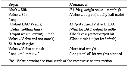 在逐次逼近ADC中,內(nèi)部DAC的位模擬系列二進(jìn)制重量,比較器輸出模擬天平指示。驅(qū)動(dòng)權(quán)位處理的邏輯保存在封裝好的ADC的逐次逼近寄存器(SAR)或者控制DAC/比較器電路的處理器軟件子程序,該子程序可由不到20行的代碼來(lái)實(shí)現(xiàn)。