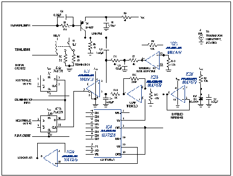 圖8中比較器(IC3)采用單電源供電、地電位檢測(cè)以及僅10ns傳輸延遲。DAC (IC4)為雙通道器件,一方面用于脈沖高度測(cè)量,另一方面驅(qū)動(dòng)LCD對(duì)比度控制(如圖3)。注意DAC為反向驅(qū)動(dòng);電流輸出端連接在一起由經(jīng)過(guò)緩沖的電壓基準(zhǔn)驅(qū)動(dòng),基準(zhǔn)輸入作為電壓輸出(每路帶有一個(gè)外部放大器緩沖)?! ?br />