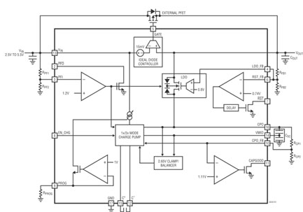 任何可高效地滿足上述小到中電流超級電容器充電器 IC 設計限制的解決方案都會包括一個面向兩節(jié)串聯(lián)超級電容器和基于充電泵的充電器以及自動容量平衡和電壓箝位。凌力爾特已經(jīng)為這類應用開發(fā)出了一個簡單但尖端的單片超級電容器充電器 IC,該 IC 不需要電感器,也不需要平衡電阻器,提供了反向隔離,并有多種工作模式,而且靜態(tài)電流還很低。