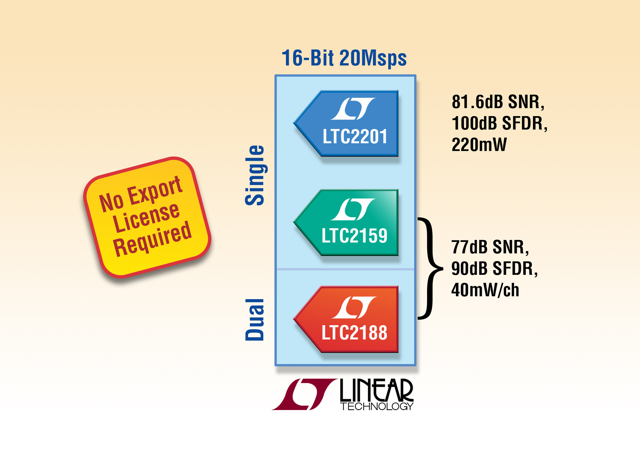 近日,凌力爾特公司 (Linear Technology Corporation) 非常高興地宣布三款新的 16 位 20Msps ADC 擁有出口管制分類號(hào) (ECCN) 3A991,因此這些器件無需美國的出口許可證,就可向中國、俄羅斯以及其他有關(guān)國家供貨。