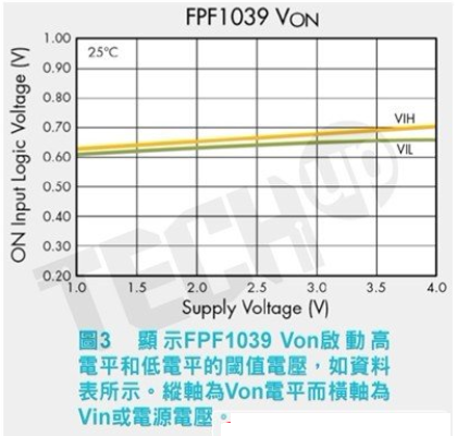 資料表中的規(guī)格增加了針對(duì)製程、電壓和溫度變化的緩衝,表明Von必須超過(guò)1.0V來(lái)開(kāi)啟開(kāi)關(guān),并且必須低于0.4V來(lái)關(guān)閉開(kāi)關(guān)。這帶來(lái)了非常簡(jiǎn)單的驅(qū)動(dòng)電路,可以直接連接至微處理器。此Von規(guī)格隨元件而不同且可能不一定會(huì)如圖3那樣平坦。不要停留在資料表中顯示靜態(tài)閾值電平的那一行;可以參照曲線來(lái)瞭解全部詳情。