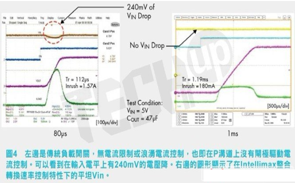 我們應(yīng)該更進(jìn)一步鉆研的下一代智慧型FET的特性是當(dāng)開(kāi)關(guān)關(guān)閉時(shí)會(huì)發(fā)生什么?採(cǎi)用離散P溝道的傳統(tǒng)負(fù)載開(kāi)關(guān)可以完全關(guān)閉并連接輸入至輸出,不管是重負(fù)載還是大電容載入在輸出腳上。如果這種情況發(fā)生,通常初級(jí)端輸入電平會(huì)顯示電壓突降,它可能影響與偏置電平相關(guān)聯(lián)的精密類(lèi)比數(shù)位轉(zhuǎn)換器(ADC)或感測(cè)器。在過(guò)去,電阻/電容(R/C)網(wǎng)路添加至閘極以降低開(kāi)啟速度,但這會(huì)增加專(zhuān)案的設(shè)計(jì)時(shí)間和規(guī)模。Intellimax支援轉(zhuǎn)換速率控制特性,藉著在輸入端限制浪涌電流,可使電平中斷最小化。圖4顯示了此方案在實(shí)證研究的實(shí)驗(yàn)室測(cè)試中的一個(gè)例證。注意,左邊為採(cǎi)用傳統(tǒng)P溝道方法對(duì)Vin電平的影響,右邊的則是Intellimax器件的影響。