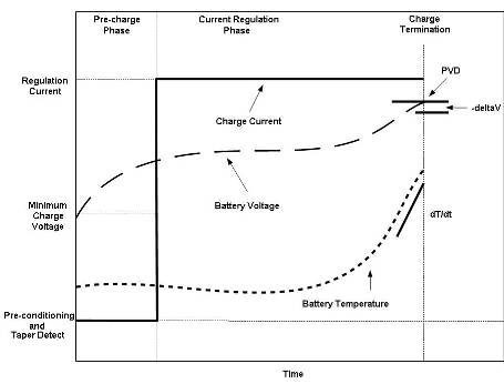 當(dāng)電池溫度和電壓正確時(shí)快速充電開始。通常用 1C 或更低的恒定電流對 NiMH 電池進(jìn)行充電。一些 NiCd 電池可以用高達(dá) 4C 的速率進(jìn)行充電。采用適當(dāng)?shù)某潆娊K止來避免有害的過充電。