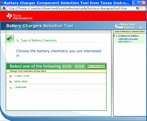 電池充電器工具使得設(shè)計(jì)人員選擇正確的充電器的過程更輕松。圖 3 是 TI 網(wǎng)站上提供的一種工具的示例。