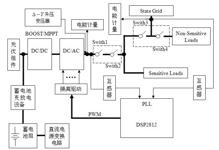 微網(wǎng)逆變器系統(tǒng)將可再生能源(如太陽(yáng)能,風(fēng)能,水能,地?zé)崮?,生物質(zhì)能等)轉(zhuǎn)變?yōu)榕c電網(wǎng)同頻、同相的交流電,優(yōu)先輸送給當(dāng)?shù)刎?fù)荷供電,剩余的電能饋入電網(wǎng)。微網(wǎng)逆變器系統(tǒng)主要包括:光伏組件,蓄電池組,蓄電池充放電設(shè)備,DC/DC 變換器,微網(wǎng)逆變器,靜態(tài)開關(guān)等。