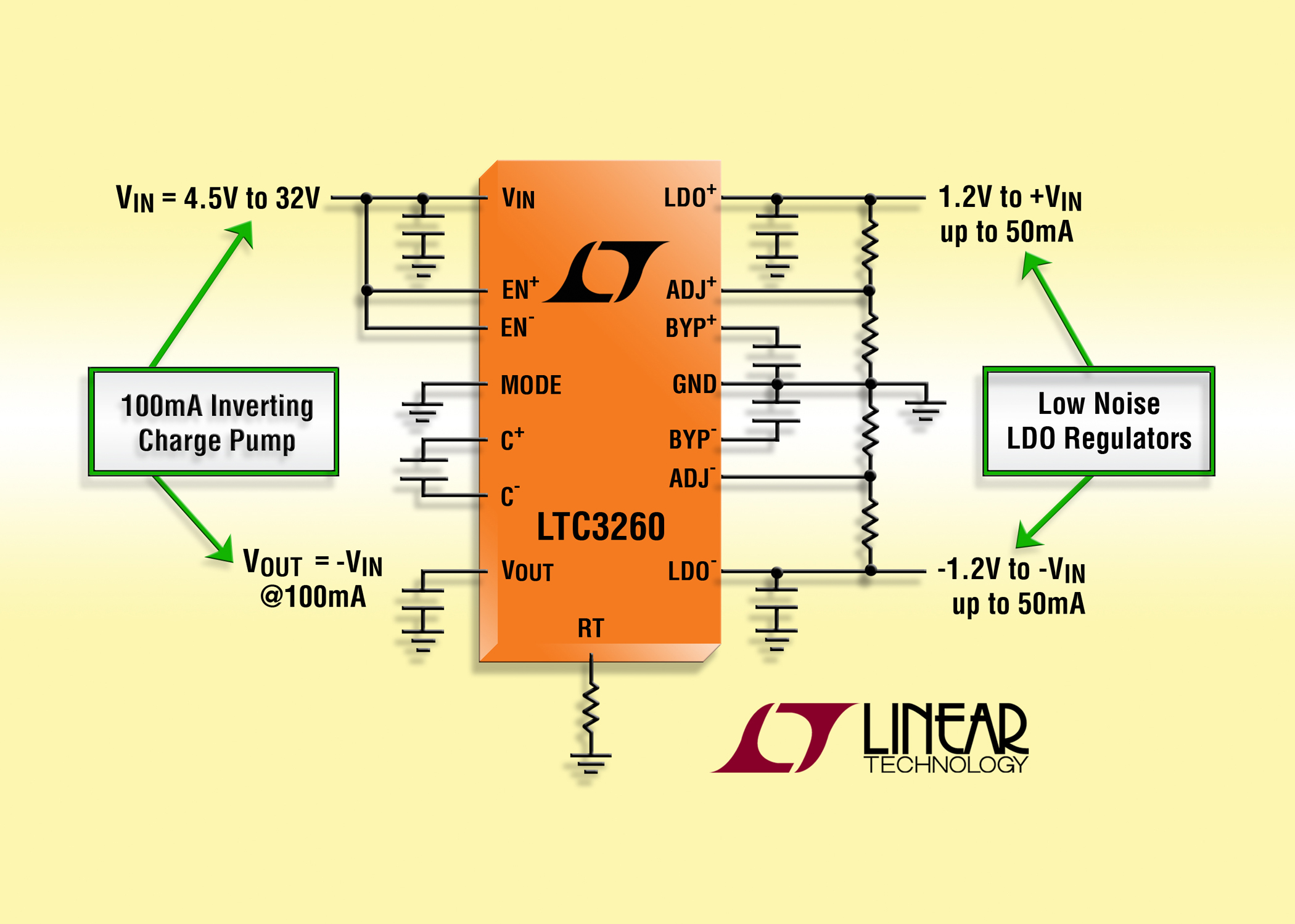 LTC3260 和 LTC3261 非常適用于各種應用,例如用高壓輸入產生的低噪聲雙極性 / 負輸出電源、工業(yè) / 儀器用低噪聲偏置電壓發(fā)生器、便攜式醫(yī)療設備和汽車信息娛樂系統(tǒng)。