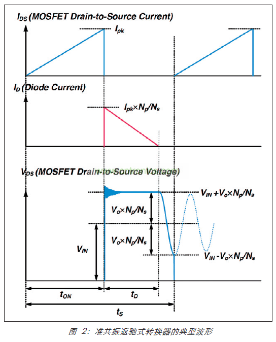 圖 2 顯示準(zhǔn)共振返馳式轉(zhuǎn)換器的典型波形。如果二極管電流在 MOSFET 關(guān)閉后達(dá)到零,則 MOSFET VDS 會(huì)由于原邊電感器 (Lm) 與 MOSFET 輸出電容器 Coss 之間的共振而開(kāi)始振蕩。在 VDS 達(dá)到其最小值時(shí)(因漏極與源極之間的電容負(fù)載,降低 MOSFET 導(dǎo)通開(kāi)關(guān)損耗),通過(guò)開(kāi)啟 MOSFET 來(lái)實(shí)現(xiàn)準(zhǔn)共振交換。設(shè)計(jì)變壓器匝數(shù)比 Np/Ns,以便共振振幅大于 VIN,從而使零電壓開(kāi)關(guān) MOSFET 能夠?qū)崿F(xiàn)。