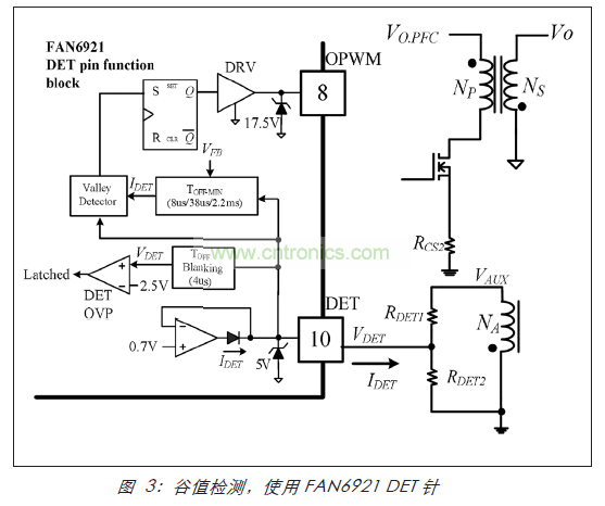 首次進(jìn)行準(zhǔn)共振轉(zhuǎn)換器設(shè)計(jì)之前,在前面所述的應(yīng)用說(shuō)明的幫助下,了解將面臨的主要問(wèn)題是一件非常值得的事情。正如討論的那樣,可靠檢測(cè) MOSFET 電壓谷值是準(zhǔn)共振轉(zhuǎn)換器操作中的要素。某些 PWM 轉(zhuǎn)換器實(shí)施此功能要比其他轉(zhuǎn)換器做得更好,因此在評(píng)價(jià)競(jìng)爭(zhēng)對(duì)手的設(shè)備時(shí),務(wù)必留意這一點(diǎn)。例如,圖 3 顯示使用 Fairchild FAN6921 PWM 控制器的谷值檢測(cè)電路的典型應(yīng)用。通過(guò)監(jiān)視流出谷值檢測(cè)針 (DET) 的電流來(lái)檢測(cè)MOSFET的電壓谷值;當(dāng)流出檢測(cè)針的電流超過(guò)30μA 時(shí),將觸發(fā)該電路。這是特別有吸引力的解決方案,因?yàn)樗恍枰粋€(gè)變壓器輔助線圈和兩個(gè)電阻。