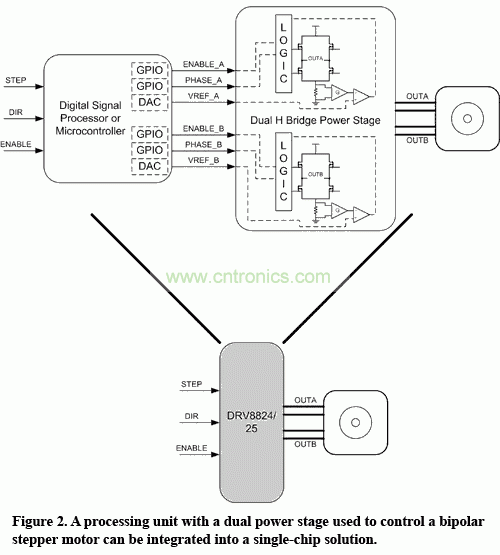 圖 2 具有雙極步進(jìn)馬達(dá)控制用雙功率級(jí)的一個(gè)處理單元,可以集成到一個(gè)單片解決方案中。