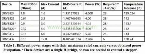 但是,利用更大的功率級(jí),可以讓RDSon變得更小。這便是DRV8825的工作原理。0.64歐姆高端到低端的RDSon最大時(shí),可以讓芯片溫度保持更低的同時(shí)提供更多的電流。如果使用了更大的功率級(jí),且RDSon參數(shù)越來越小,則有望獲得更大的電流容量。表1顯示了使用不同器件時(shí)的各種電流容量。