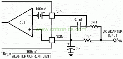 如圖4所示,這個(gè)電路限制充電電流以防止系統(tǒng)功率升高時(shí)交流適配器過(guò)載。要設(shè)定輸入電流限制,最重要的就是要最小化墻式配適器的額定電流。限流電阻可以通過(guò)下兩式來(lái)計(jì)算。