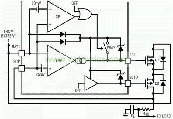 傳統(tǒng)上,雙電池系統(tǒng)是順序放電系統(tǒng),允許順序消耗電池電量(先消耗電池1,再消耗電池2),以簡(jiǎn)單地延長(zhǎng)總的電池工作時(shí)間。LTC1760采用了專有模擬控制技術(shù),可允許安全地對(duì)兩個(gè)電池并行充電或放電。圖1是一個(gè)采用LTC1760的雙電池系統(tǒng)的簡(jiǎn)化原理圖。這種結(jié)構(gòu)使充電速度提高了50%,電池工作時(shí)間延長(zhǎng)了10%。此外,并行放電不僅增強(qiáng)了電流能力,而且還降低了I2R損耗并改善了在極高負(fù)載條件下的電壓調(diào)節(jié)能力。降低I2R損耗和改善電壓調(diào)節(jié)都延長(zhǎng)了時(shí)序解決方案的總放電時(shí)間(見圖2)。