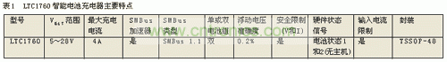 LTC1760是一個(gè)高度集成的三級(jí)電池充電器和選擇器,用于使用雙智能電池的產(chǎn)品。它是一個(gè)降壓開關(guān)拓?fù)潆姵爻潆娖?,具有符合智能電池?biāo)準(zhǔn)定義的多種功能和其他新增功能,如輸入限流和安全限制,等等。三個(gè)SMBus接口使LTC1760能實(shí)現(xiàn)諸如跟蹤兩個(gè)電池的內(nèi)部電壓和電流之類的伺服功能,并允許一個(gè)SMBus主機(jī)監(jiān)視任一電池的狀態(tài)。這種伺服技術(shù)能使充電器的準(zhǔn)確度同電池內(nèi)部電壓和電流測(cè)量值只有±0.2%的誤差。