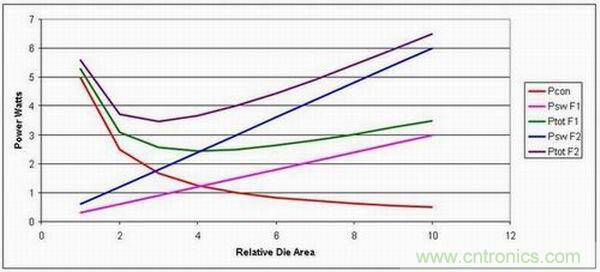 但是,在更高的工作頻率下,最佳裸片面積較小,從而帶來(lái)成本節(jié)約。實(shí)際上,在低頻率下,通過調(diào)整裸片面積來(lái)最小化損耗會(huì)帶來(lái)極高成本的設(shè)計(jì)。但是,轉(zhuǎn)到更高工作頻率后,我們就可以優(yōu)化裸片面積來(lái)降低損耗,從而縮小電源的半導(dǎo)體體積。這樣做的缺點(diǎn)是,如果我們不改進(jìn)半導(dǎo)體技術(shù),那么電源效率將會(huì)降低。