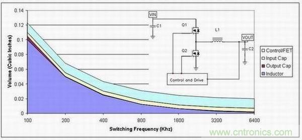 圖1顯示的是降壓電源頻率與體積的關(guān)系。頻率為100 kHz時(shí),電感占據(jù)了電源體積的大部分(深藍(lán)色區(qū)域)。如果我們假設(shè)電感體積與其能量相關(guān),那么其體積縮小將與頻率成正比例關(guān)系。由于某種頻率下電感的磁芯損耗會(huì)極大增高并限制尺寸的進(jìn)一步縮小,因此在此情況下上述假設(shè)就不容樂觀了。如果該設(shè)計(jì)使用陶瓷電容,那么輸出電容體積(褐色區(qū)域)便會(huì)隨頻率縮小,即所需電容降低。另一方面,之所以通常會(huì)選用輸入電容,是因?yàn)槠渚哂屑y波電流額定值。該額定值不會(huì)隨頻率而明顯變化,因此其體積(黃色區(qū)域)往往可以保持恒定。另外,電源的半導(dǎo)體部分不會(huì)隨頻率而變化。這樣,由于低頻開關(guān),無(wú)源器件會(huì)占據(jù)電源體積的大部分。當(dāng)我們轉(zhuǎn)到高工作頻率時(shí),半導(dǎo)體(即半導(dǎo)體體積,淡藍(lán)色區(qū)域)開始占據(jù)較大的空間比例。