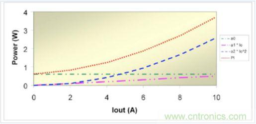 如果意識(shí)到電源損耗與輸出電流相關(guān)(可用輸出電流替換 X),那么系數(shù)項(xiàng)就能很好地與不同來源的電源功率損耗聯(lián)系起來。例如,ao 代表諸如柵極驅(qū)動(dòng)、偏壓電源和磁芯的固定開銷損耗以及功率晶體管 Coss 充電與放電之類的損耗。這些損耗與輸出電流無關(guān)。第二項(xiàng)相關(guān)聯(lián)的損耗 a1 直接與輸出電流相關(guān),其典型表現(xiàn)為輸出二極管損耗和開關(guān)損耗。在輸出二極管中,大多數(shù)損耗是由于結(jié)電壓引起的,因此損耗會(huì)隨著輸出電流成比例地增加。
