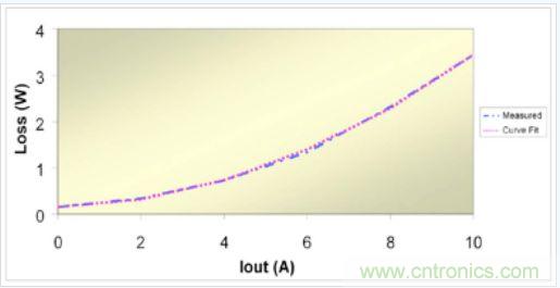 實(shí)際損耗與三項(xiàng)式之間的相關(guān)性非常好。圖 2 對同步降壓穩(wěn)壓器的測量數(shù)據(jù)與曲線擬合數(shù)據(jù)進(jìn)行了對比。我們知道,在基于求解三個(gè)聯(lián)立方程組的曲線上將存在三個(gè)重合點(diǎn)。對于曲線的剩余部分,兩個(gè)曲線之間的差異小于2%。由于工作模式(如連續(xù)或非連續(xù))不同、脈沖跳頻或變頻運(yùn)行等原因,其他類型的電源可能很難以如此匹配。這種方法并非絕對可靠,但是有助于電源設(shè)計(jì)人員理解實(shí)際電路損耗情況。