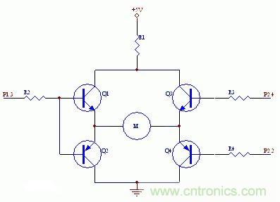 如下圖所示,些電路是作者最初設(shè)計的電路,P1.3、P2.2和P2.4分別是51單片機的IO引腳。設(shè)計的工作原理是:當P1.3高電平、P2.2和P2.4都為低電平時,電機正轉(zhuǎn)。此時,Q1和Q4導(dǎo)通,Q2和Q3截止,電流注向為+5VàR1àQ1àMàQ4;當P1.3低電平、P2.2和P2.4都為高電平時,電機反轉(zhuǎn)。此時,Q2和Q3導(dǎo)通,Q1和Q4截止。P2.2為高電平同時P2.4為低電平時,電路全不通,電機停止。圖中電阻:R1=20Ω,R2=R3=R4=510Ω