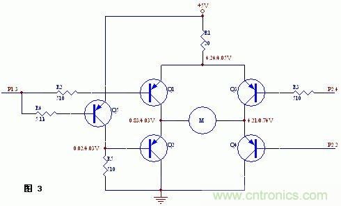 但此電路的Q1和Q3需要分別控制,所需控制引腳較多。如果要用一個IO腳控制則可以加一個反相器。但此電路的Q1和Q3需要分別控制,所需控制引腳較多。如果要用一個IO腳控制則可以加一個反相器。如圖3所示。圖中標有各點實測電壓值。