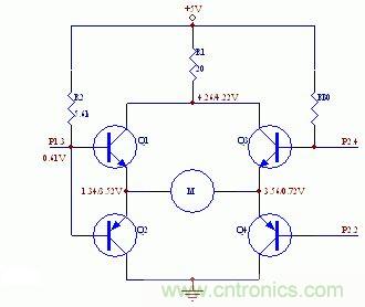 但實際實驗情況去出人意料,即電機正向和反向都不轉(zhuǎn)。經(jīng)測量,當P1.3高電平,P2.2和P2.4都為低電平時,Q4導(dǎo)通,但Q1不導(dǎo)通,P1.3的電平只有0.67V左右,這樣Q1無法導(dǎo)通。