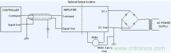 c. 為了保持命令參考電壓的恒定,要將驅(qū)動器的信號地接到控制器的信號地。它也會接到外部電源的地,這將影響到控制器和驅(qū)動器的工作(如:編碼器的 5V電源)。