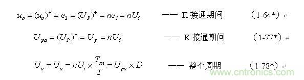 我們從(1-77)和(1-78)兩式可知,改變控制開關K的占空比D,只能改變輸出脈沖電壓(圖1-16-b中正半波)的平均值Ua,而輸出脈沖電壓的幅值Up不變。因此,正激式變壓器開關電源用于穩(wěn)壓電源,只能采用改變正激變壓器次級線圈輸出脈沖電壓的平均值的方式,然后再經(jīng)濾波輸出直流電壓。