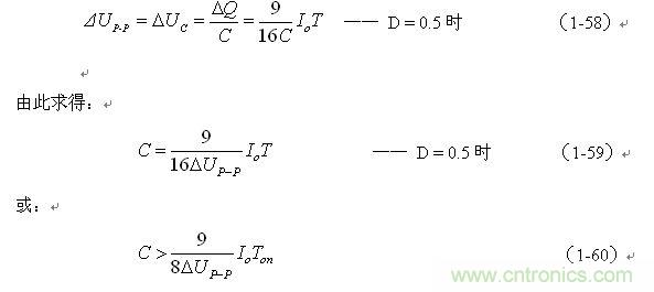 (1-59)和(1-60)式,就是計算并聯(lián)式開關(guān)電源儲能濾波電容的公式。式中:Io是流過負(fù)載電流的平均值,T為開關(guān)工作周期,ΔUP-P為濾波輸出電壓紋波,此紋波電壓ΔUP-P實際上就是電容器兩端的充放電電壓增量,即:ΔUP-P = ΔUc 。